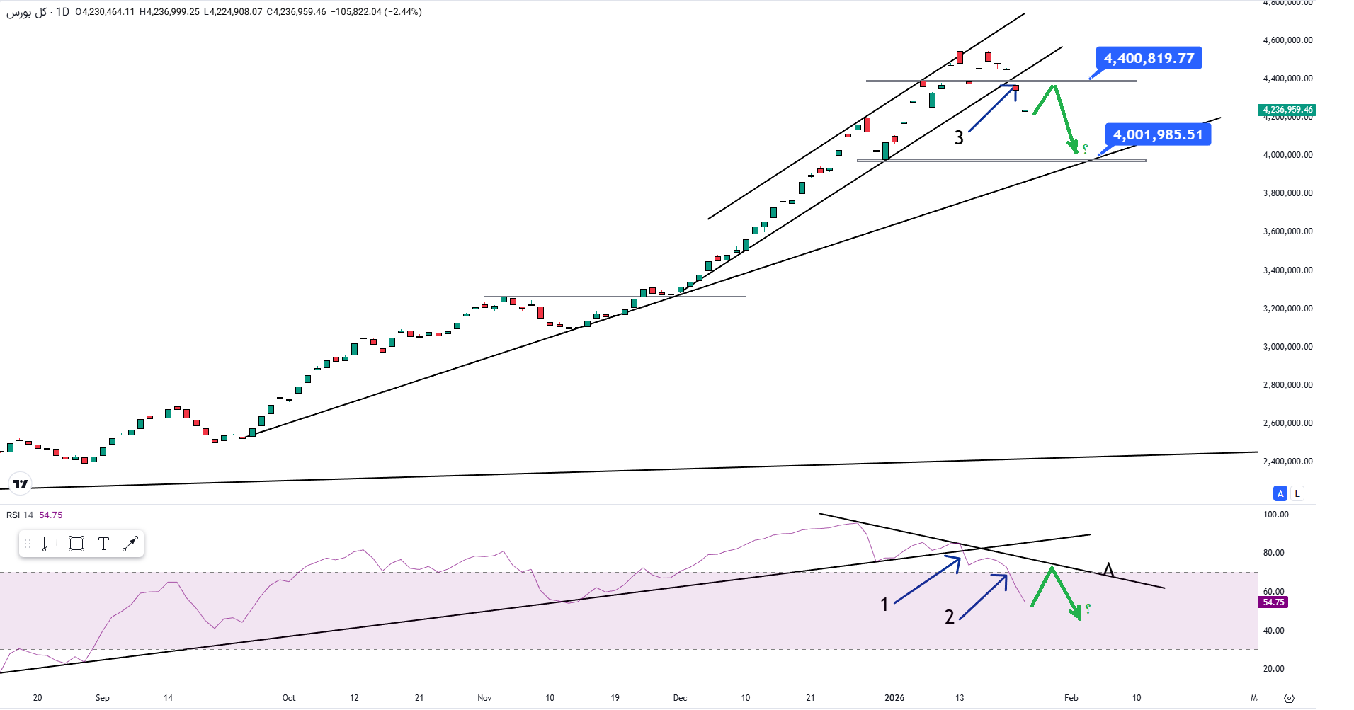 حمایت اول در نمودار قیمت در حدود 4 میلیون واحد خواهد بود و هرگونه برگشت احتمالی آن به سمت 4400 در روز های آینده (نزدیک )که با بازگشت R S I به سمت روند نزولی "A" همراه خواهد بود میتواند برای بازار بعنوان نقطه فروش شناخته شود .